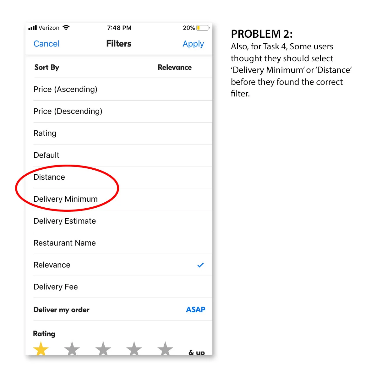 Observation: When users were looking for the fastest delivery times in Task 4, there were many issues that they encountered. Some users did not know they could filter the way results were sorted and gave up before finding the ‘Delivery Estimate’. Some users thought they should select ‘Delivery Minimum’ or ‘Distance’ before they found the correct filter. Finally, many users selected ‘Deliver my Order ASAP’ which is a feature that allows users to schedule their delivery and does not give them results based on lowest delivery time. Due the problems mentioned above, Grubhub had a 40% task success rate for this task while DoorDash has 86.6%.