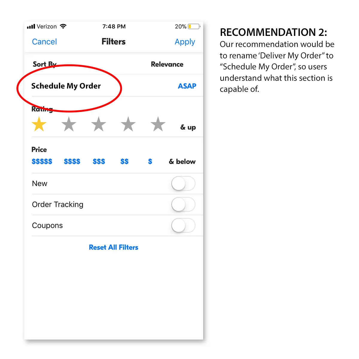 Recommendation: Our recommendation would be to rename ‘Deliver My Order” to “Schedule My Order”, so users understand what this section is capable of. We also recommend adjusting the filter ‘Delivery Minimum’ to ‘Delivery Price Minimum’ and adjusting ‘Delivery Estimate’ to ‘Delivery Time Estimate’ so users do not confuse the two.